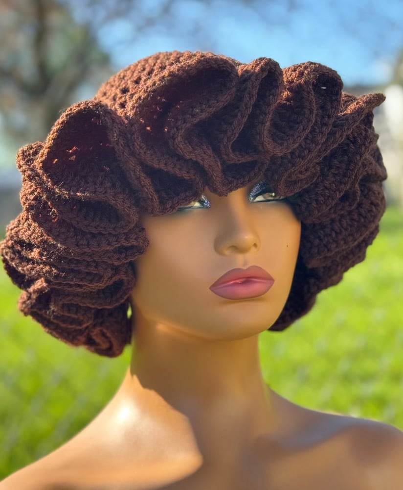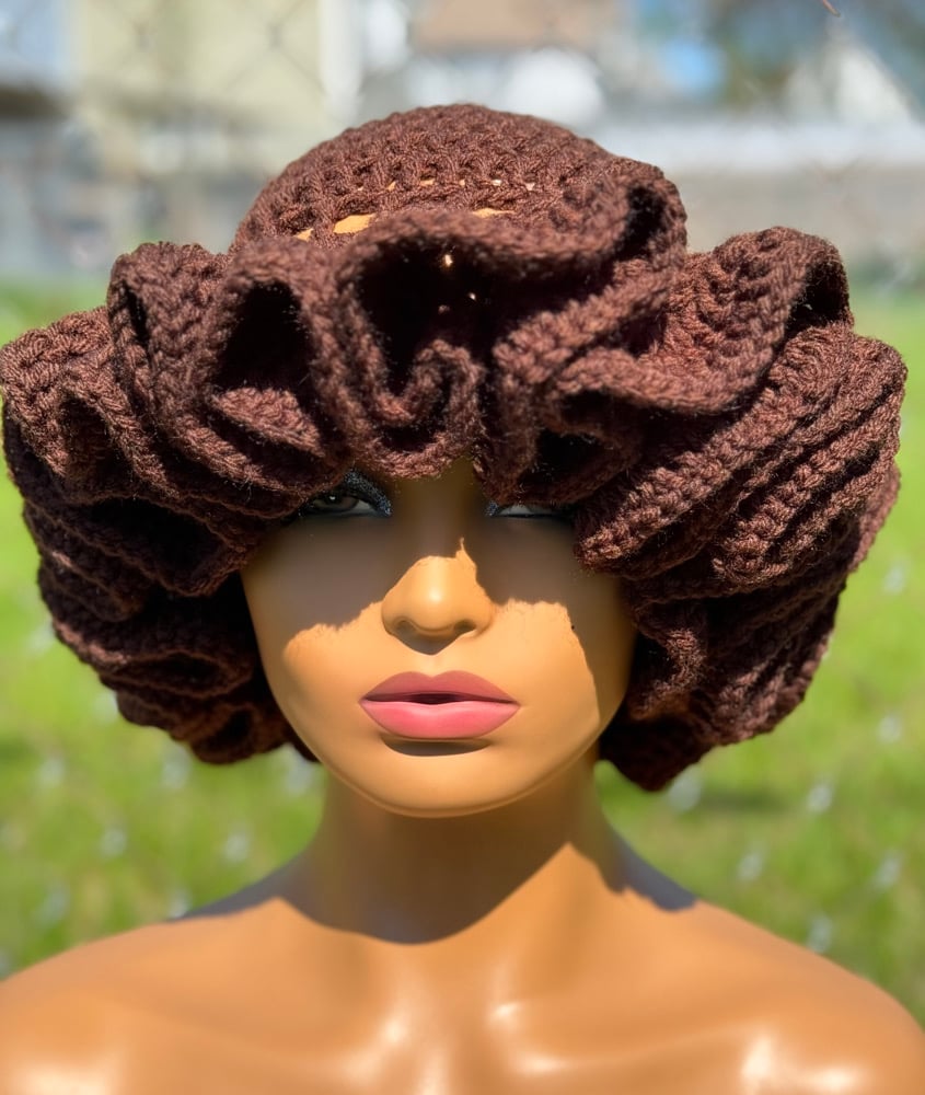 Handmade crochet hat with delicate ruffle edging. Stylish and cozy for all seasons