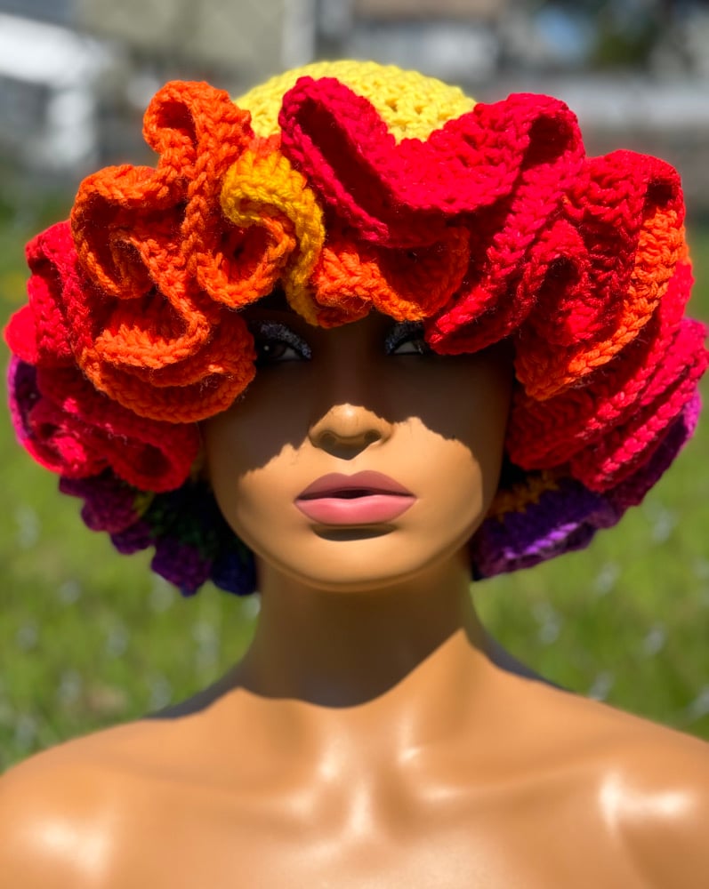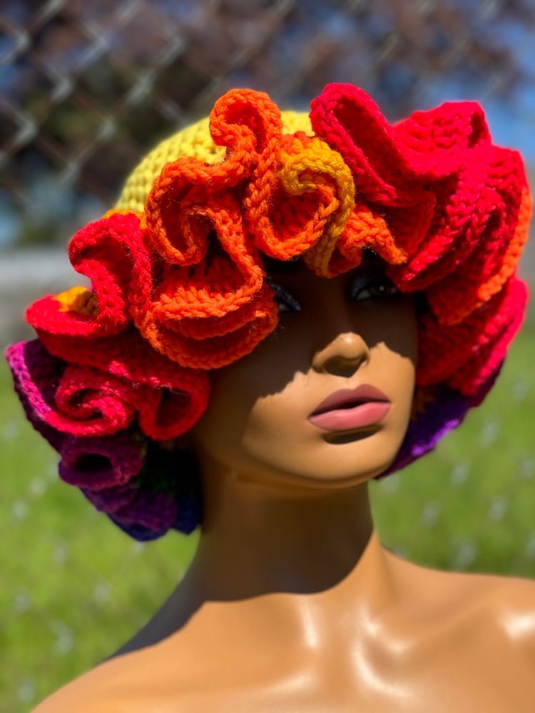 Handmade crochet hat with delicate ruffle edging. Stylish and cozy for all seasons